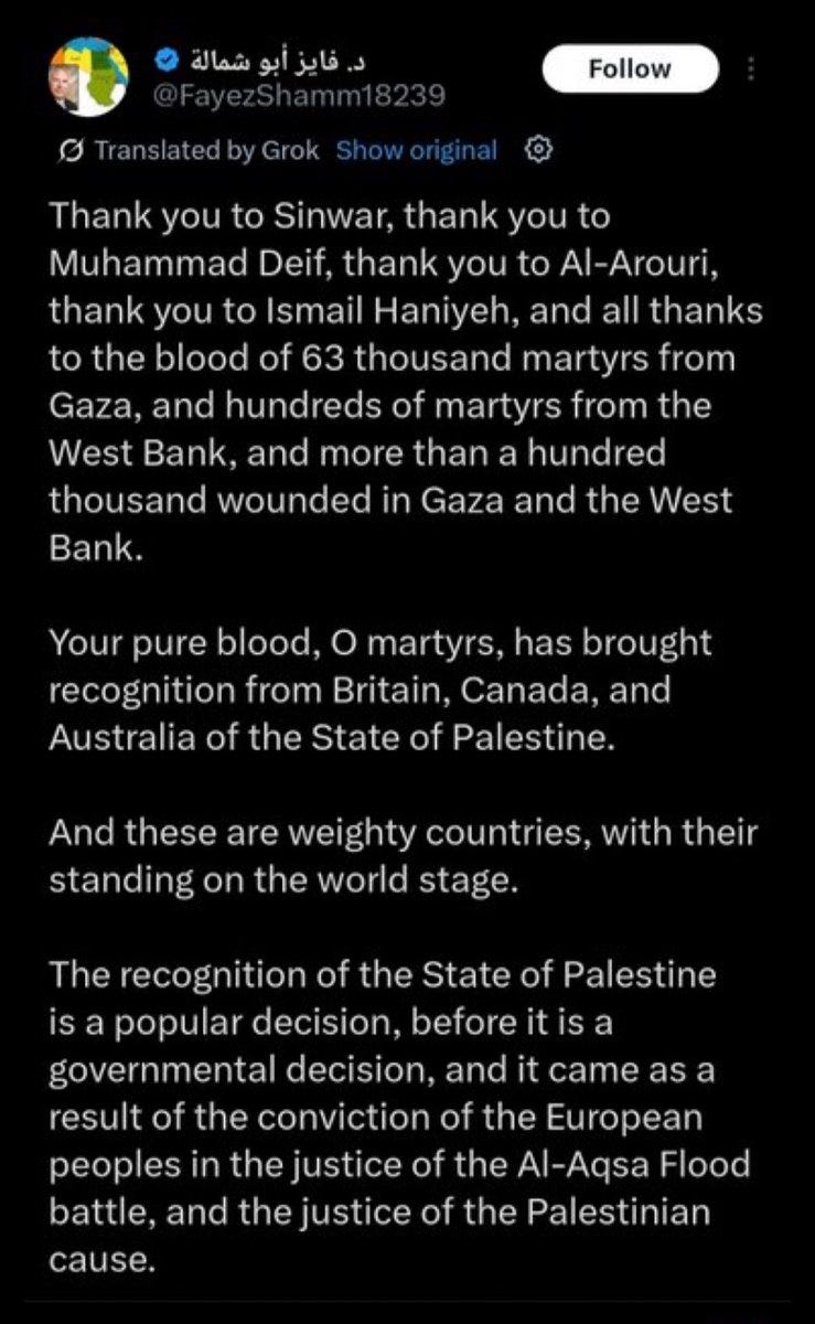 All of these world leaders then go on to say that the recognition of a state of Palestine is no reward for the actions of October 7. They are then directly contradicted by every single person with any connection to the terror forces of the PLO or Hamas. Or anyone else with half a brain.